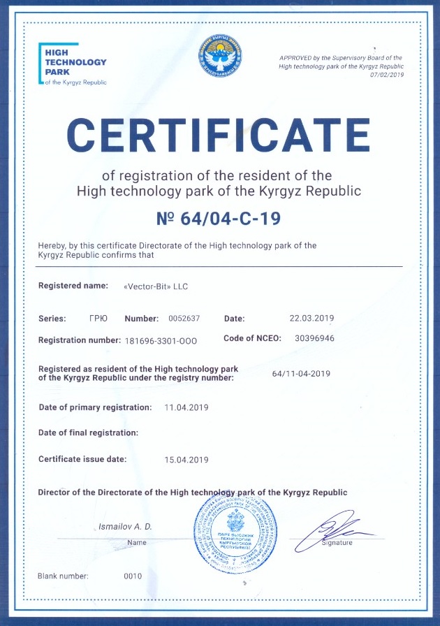 Общество с ограниченной ответственностью «Вектор-Бит» была создана 22.03.2019г., является резидентом Парка высоких технологий Кыргызской Республики и зарегистрированное в качестве резидента в установленном настоящим Законом.