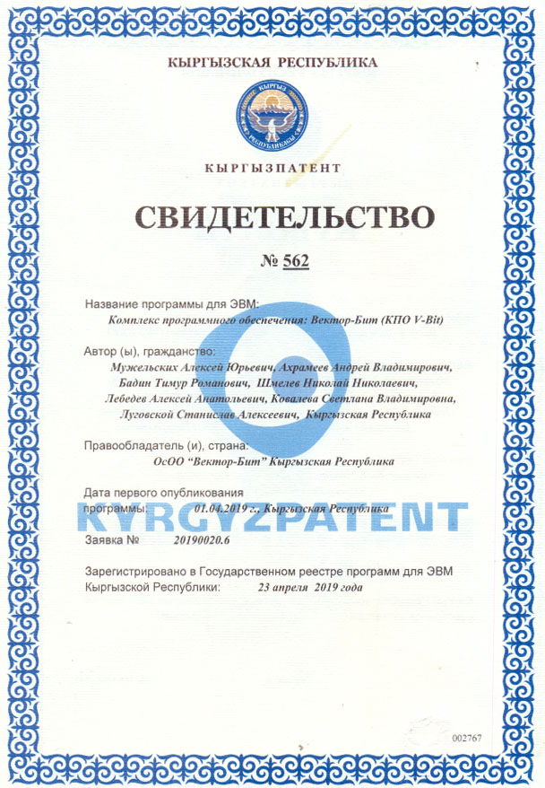 В 2019 году Государственное агентство интеллектуальной собственности и инноваций (Кыргызпатент) зарегистрировал патент за номером №562 на программное обеспечение «V-Bit».